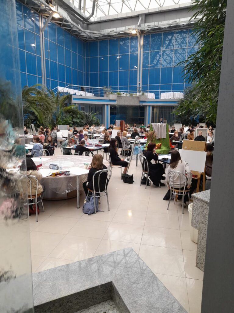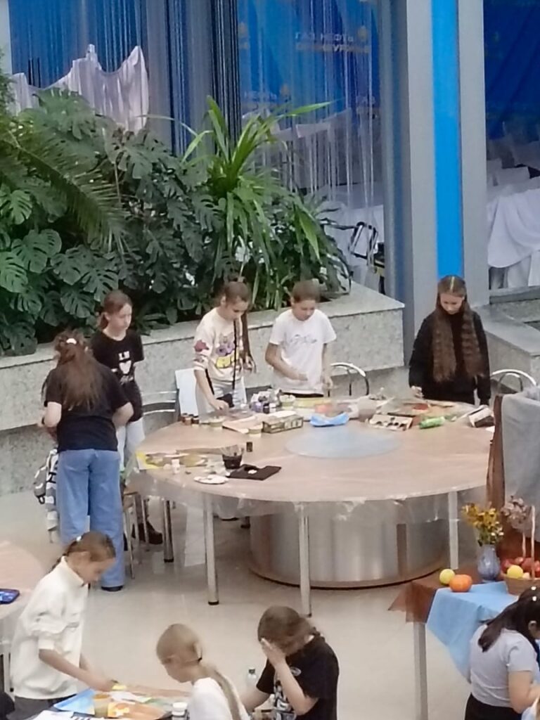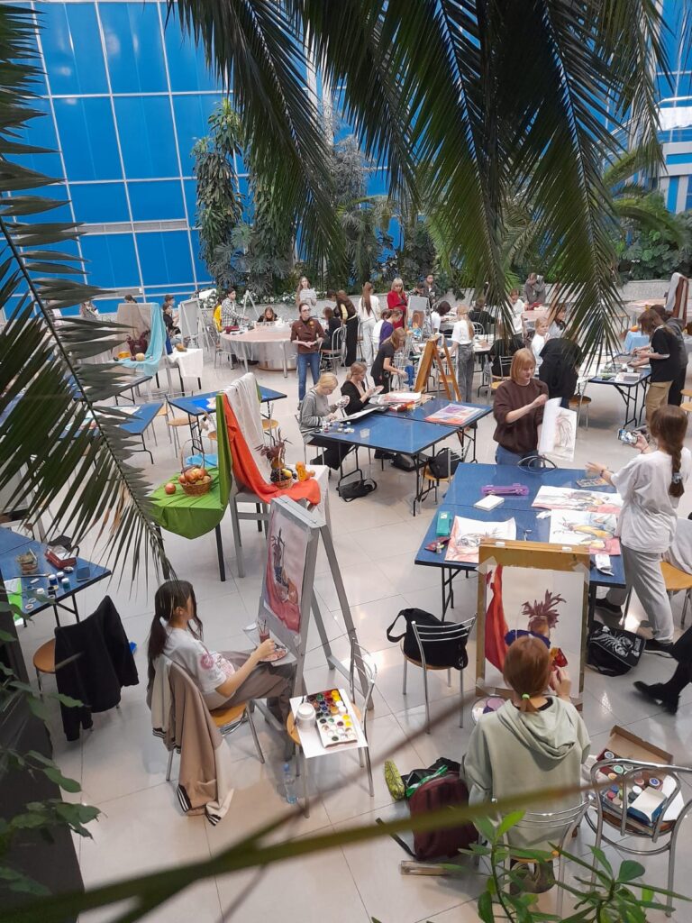 В нем в очном и заочном формате принимают участие воспитанники учреждений дополнительного образования и другие ребята, занимающиеся различными видами творчества. В рамках первого дня состоялся очный конкурс юных художников, темой которого был натюрморт «Дары осени». Участники, расположившись в Зимнем саду, в течение трех часов писали гуашью натюрморты с натуры — подобранных для разных возрастных категорий постановок.